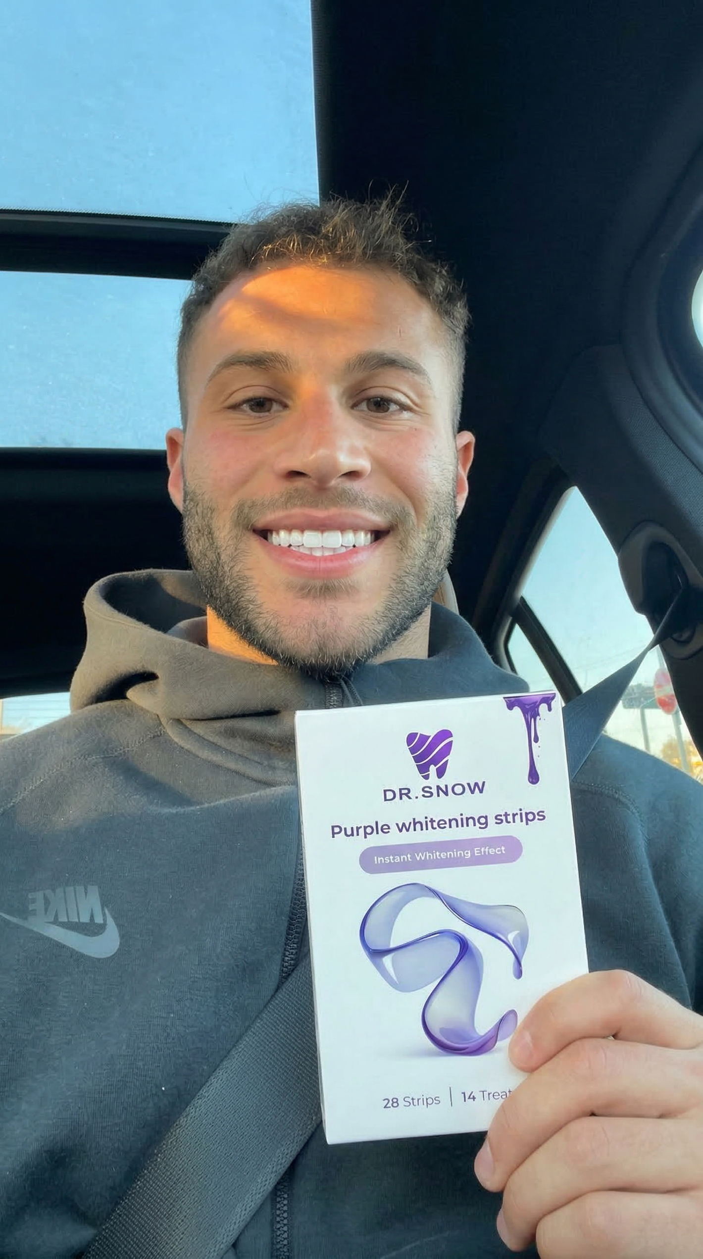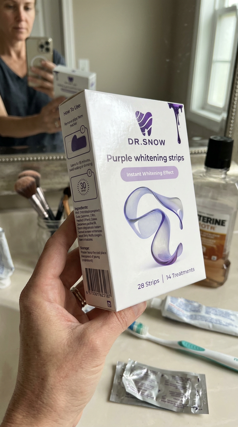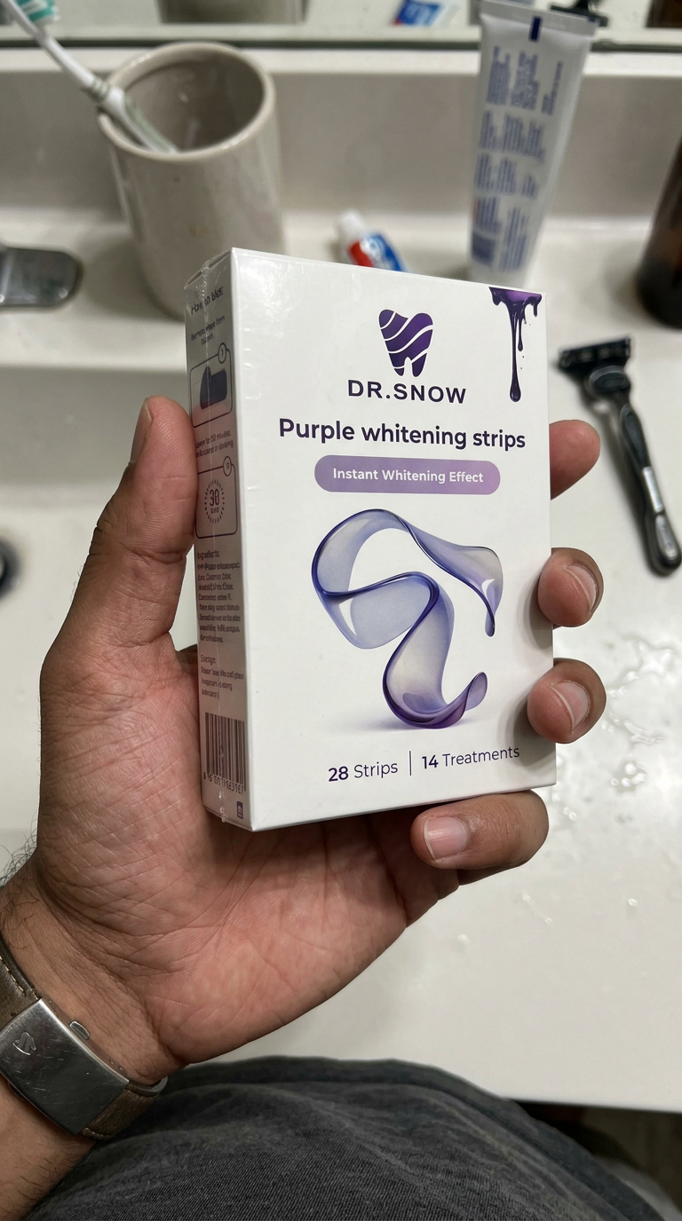 Box of Dr. Snow purple whitening strips on a white background